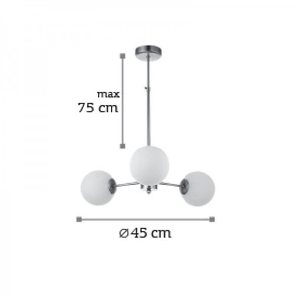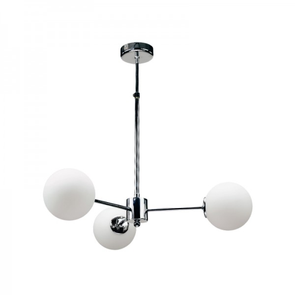 Πρόκειται για ένα χρώμιο μεταλλικό φωτιστικό με λευκή οπαλίνα στο τελείωμα και τρεις λαμπτήρες. Η μίνιμαλ σχεδίασή του το τοποθετεί ιδανικά σε οποιονδήποτε μοντέρνο εσωτερικό χώρο. Η ανάρτησή του είναι μεταλλική και ρυθμιζόμενη ώστε να προσαρμοστεί ιδανικά στον χώρο τοποθέτησής του.