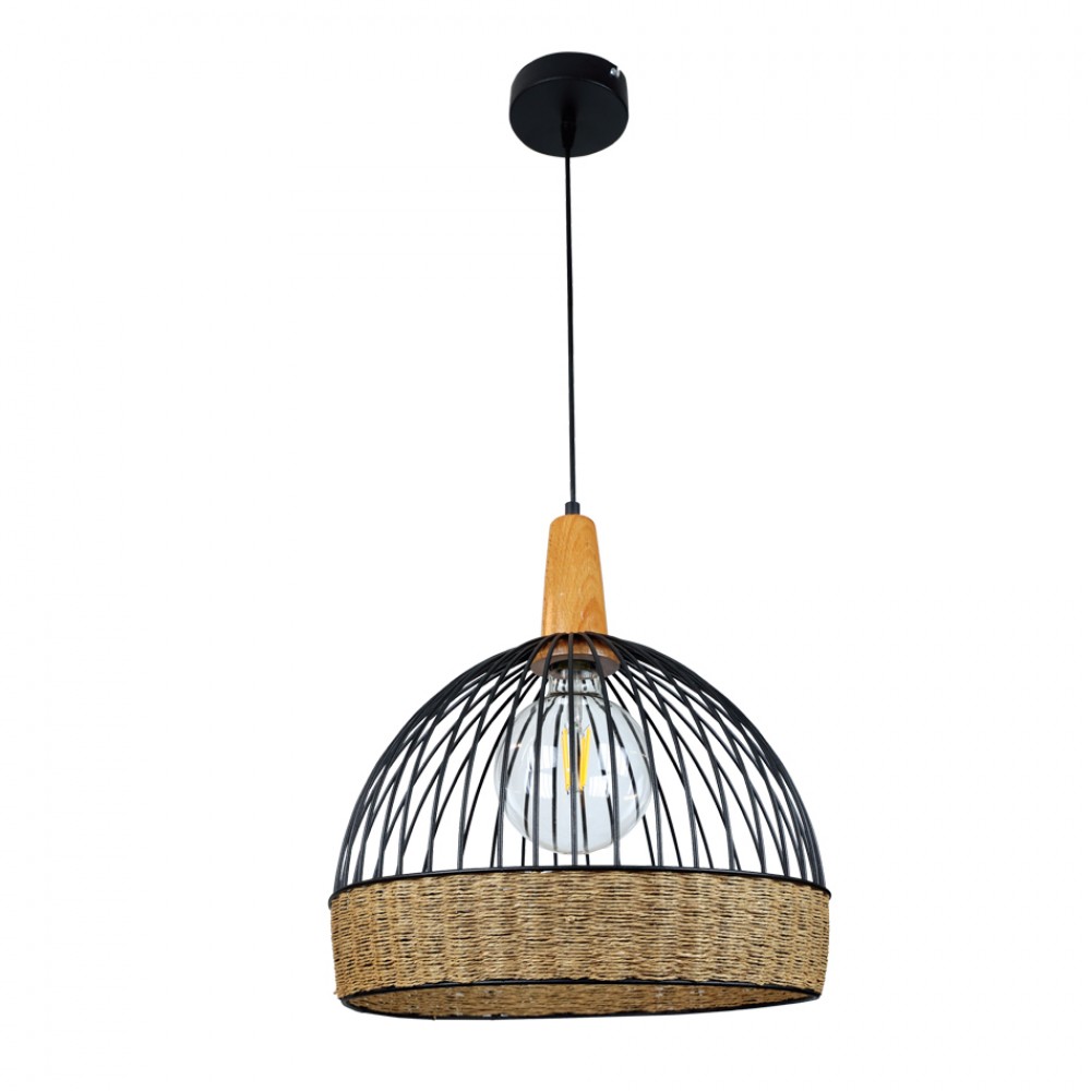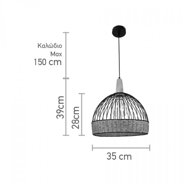 Κρεμαστό φωτιστικό από μαύρο μέταλλο, σχοινί και ξύλο 1XE27 D:35cm