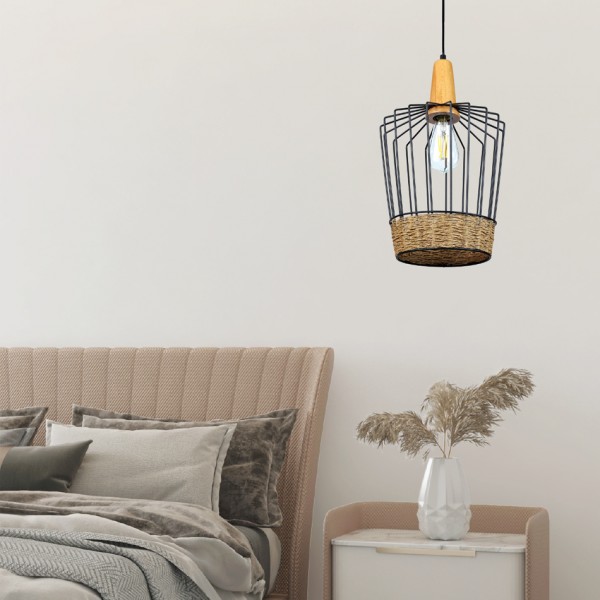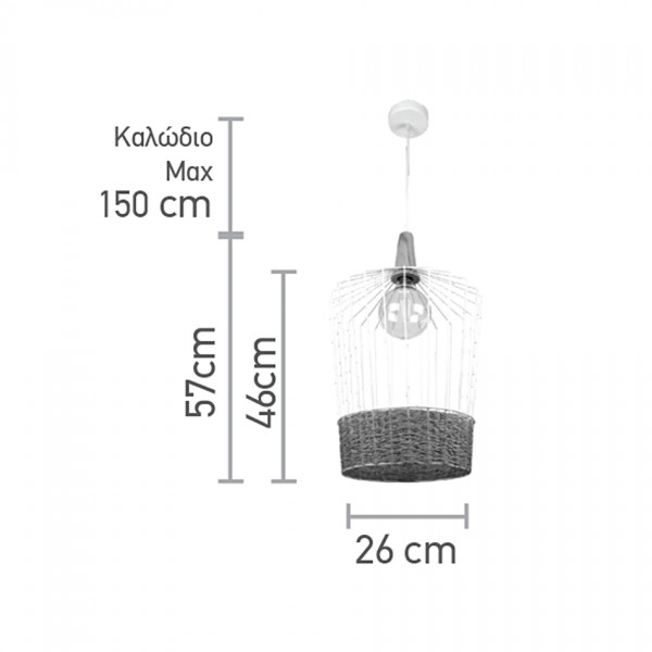 ρεμαστό φωτιστικό από λευκό μέταλλο, σχοινί και ξύλο 1XE27 D:26cm