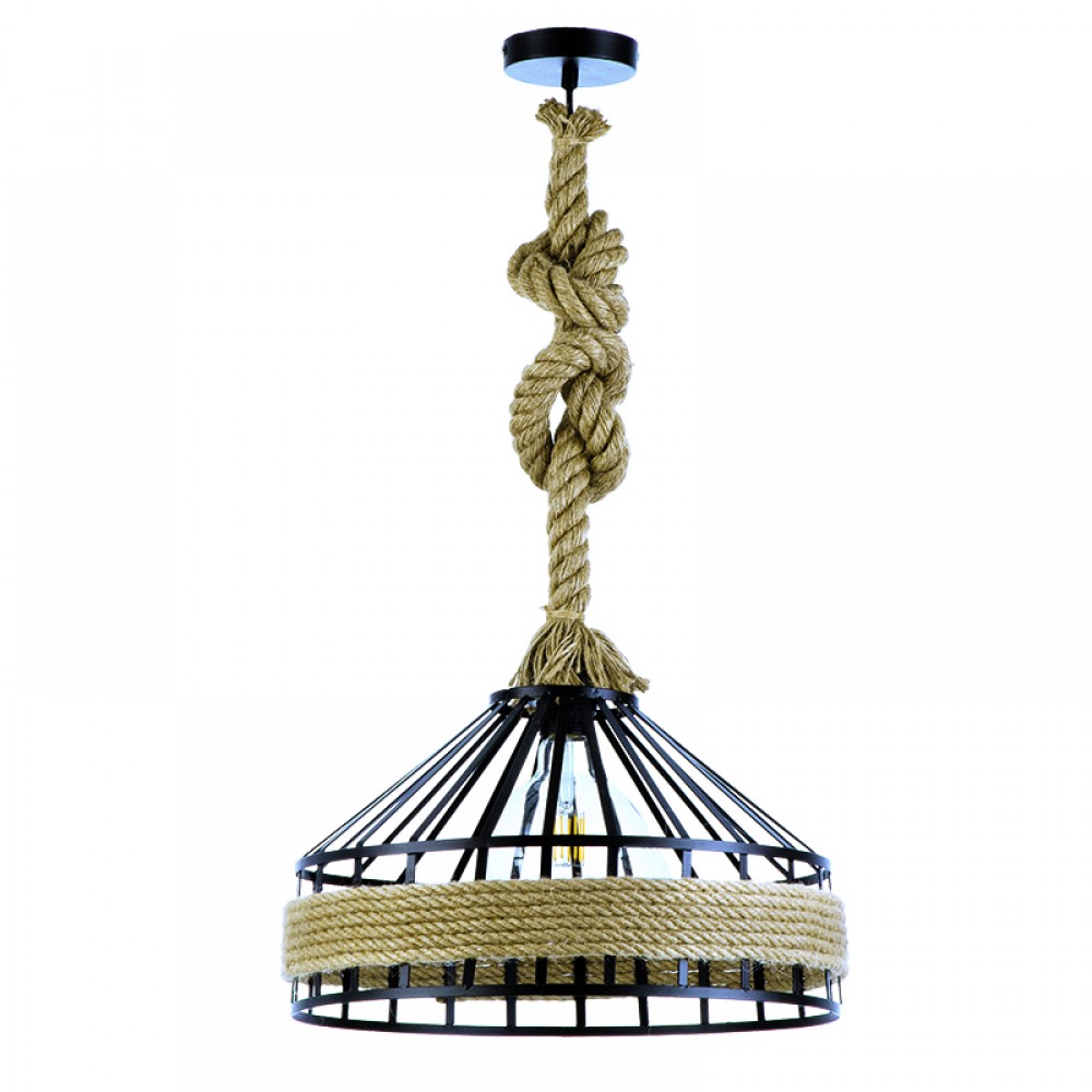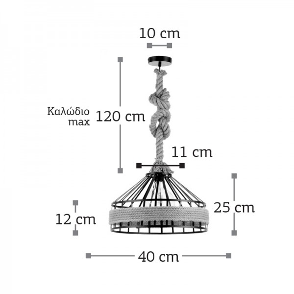 Κρεμαστό φωτιστικό από καφέ σχοινί και μαύρο μέταλλο 1XE27 D:40cm