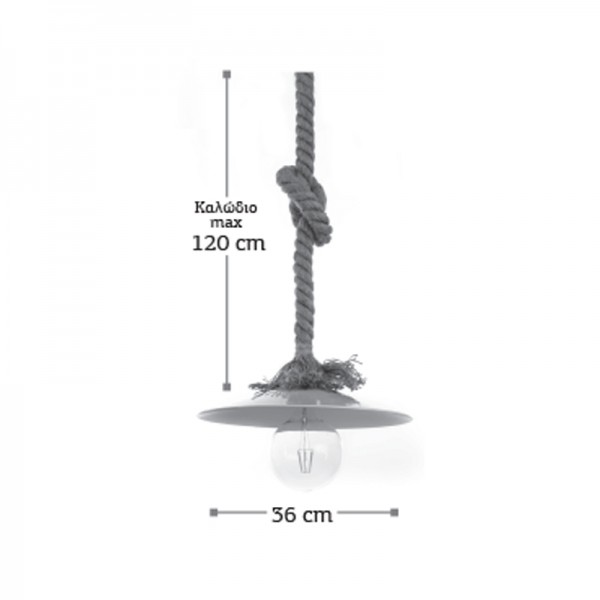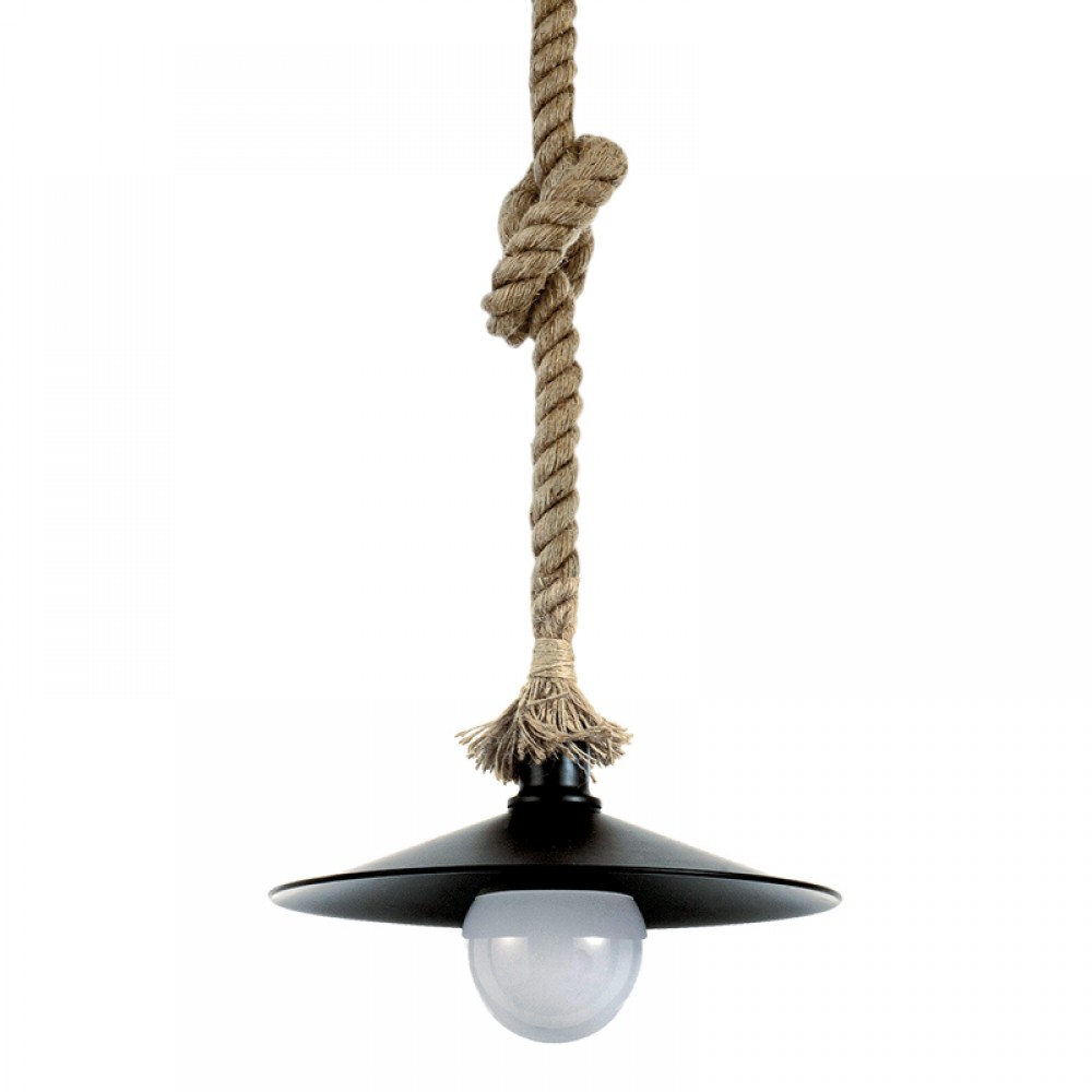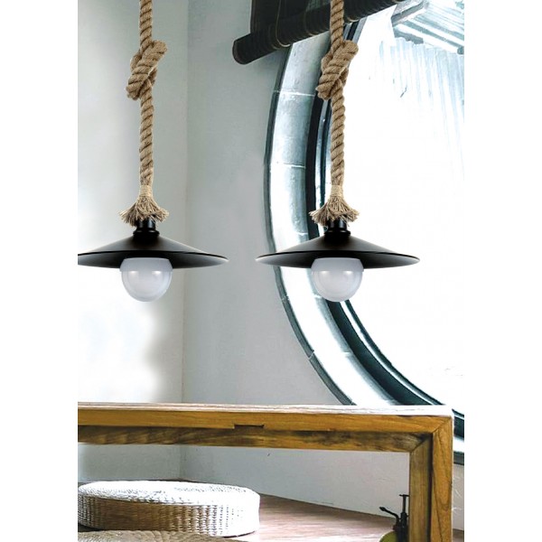 Πρόκειται για ένα κρεμαστό φωτιστικό με συνδυασμό καφέ σχοινιού και μαύρου μετάλλου. Η ανάρτηση από σχοινί μπορεί να ρυθμιστεί για να προσαρμοστεί στον κάθε χώρο.