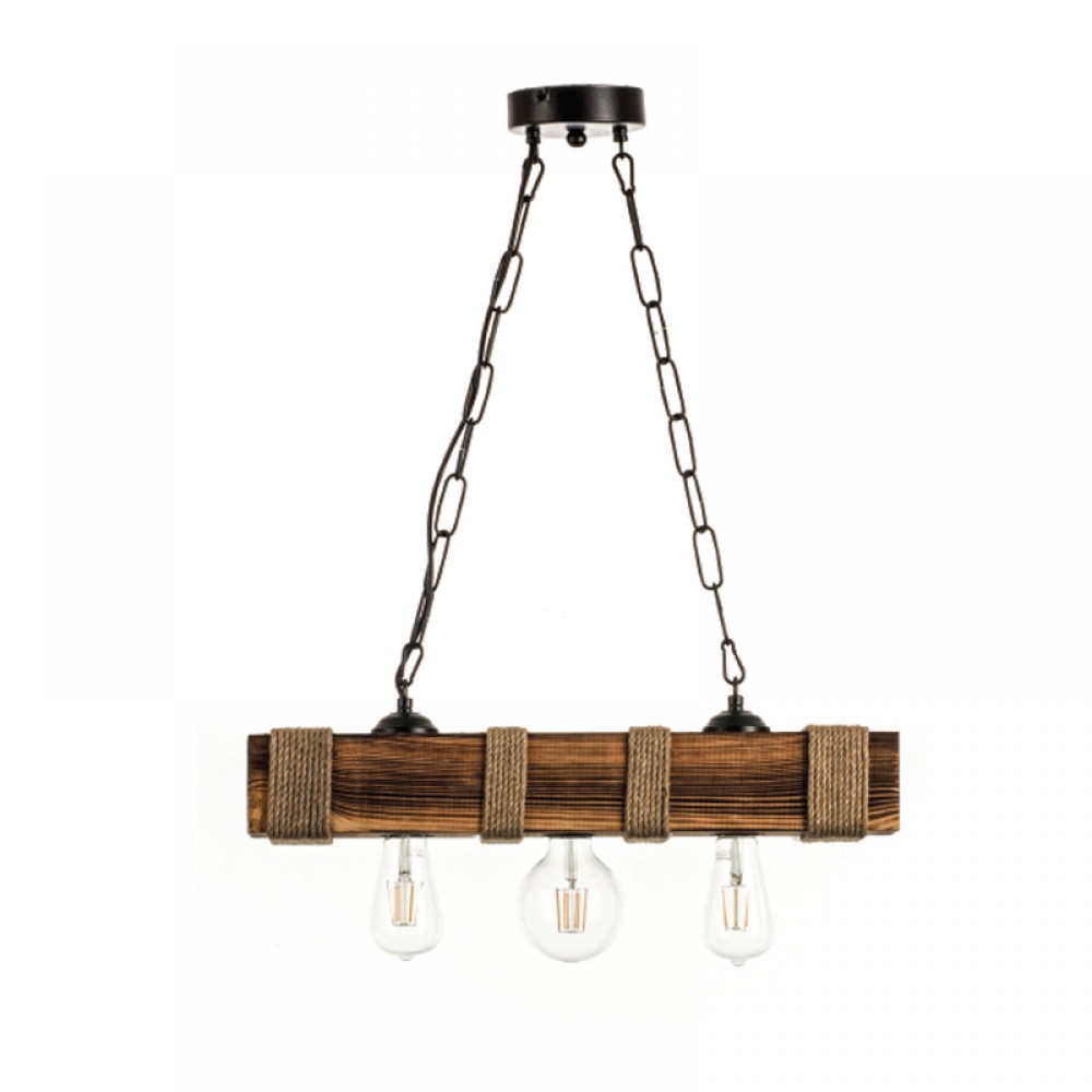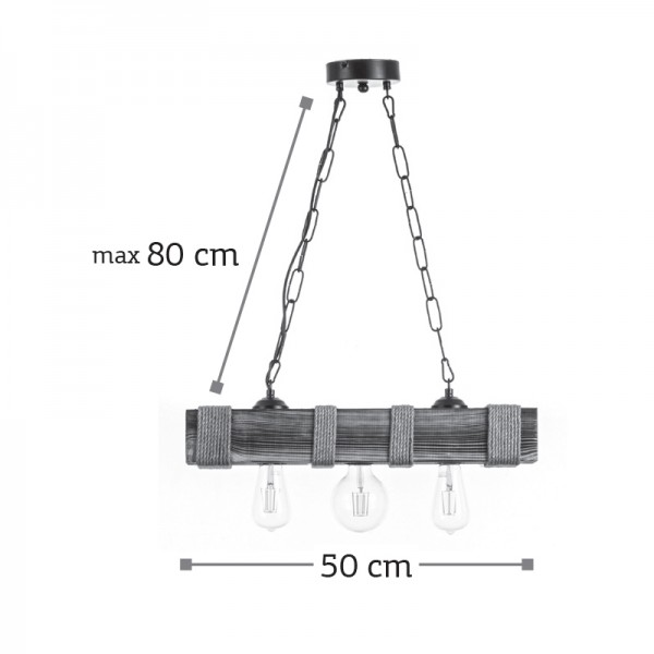 Πρόκειται για ένα κρεμαστό με τρεις λαμπτήρες που συνδυάζει αρμονικά το ξύλο και το σχοινί. Το προϊόν ολοκληρώνει η μαύρη αλυσίδα που του επιτρέπει να προσαρμόζεται ιδανικά στον κάθε χώρο.