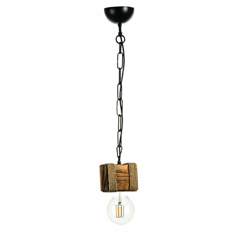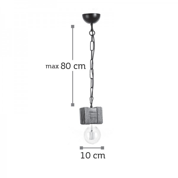 Πρόκειται για μονόφωτο κρεμαστό που συνδυάζει αρμονικά το ξύλο και το σχοινί. Το προϊόν ολοκληρώνει η μαύρη αλυσίδα που του επιτρέπει να προσαρμόζεται ιδανικά στον κάθε χώρο. Μπορεί να τοποθετηθεί είτε ως μονάδα είτε δύο ή τρία μαζί σε ράγα ή ροζέτα για ένα πιο φωτεινό αποτέλεσμα.