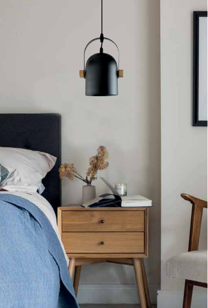 Πρόκειται για ένα κρεμαστό φωτιστικό κατασκευασμένο από λευκό μέταλλο και ξύλινη βάση. Η ανάρτησή του είναι από λευκό καλώδιο ώστε να μπορεί να ρυθμιστεί ιδανικά στον κάθε χώρο. Το μπροστινό μέρος κινείται για να προσαρμοστεί στις ανάγκες του χώρου τοποθέτησής του.