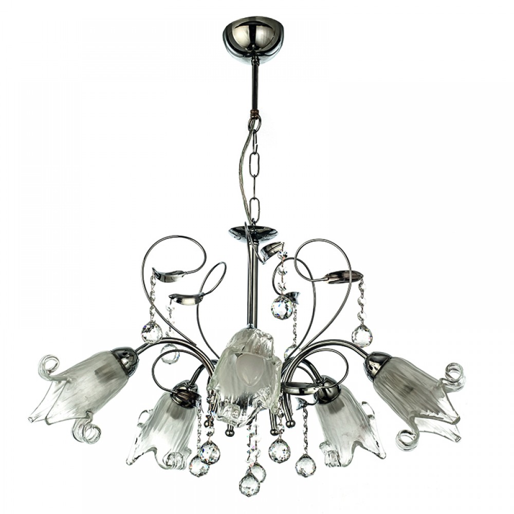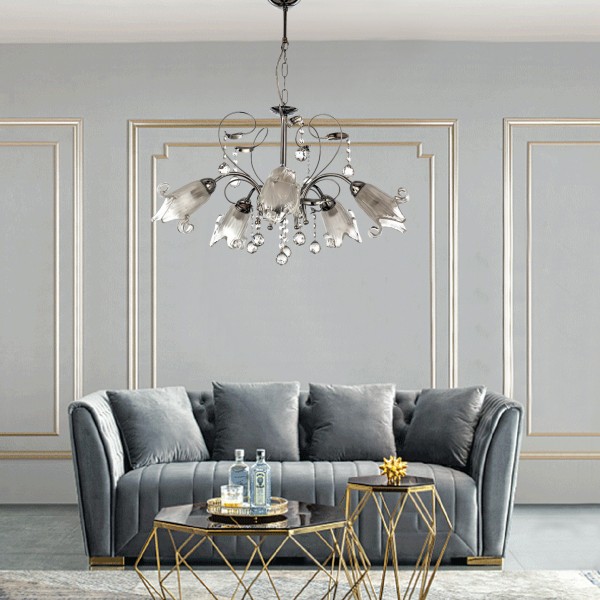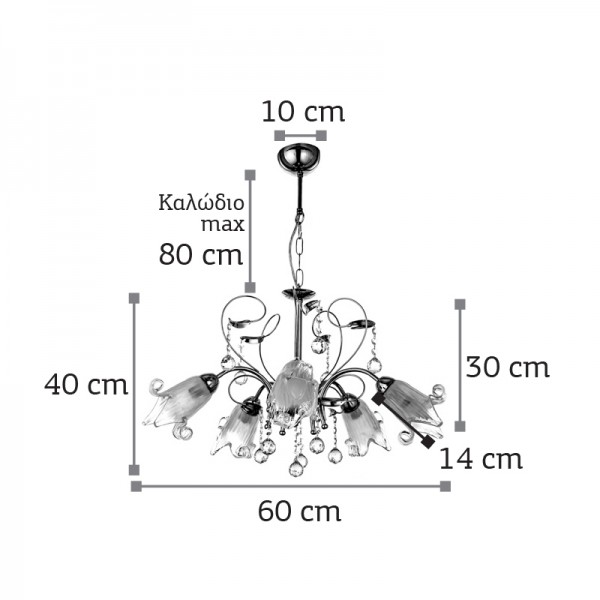 Πρόκειται για ένα κρεμαστό φωτιστικό από χρώμιο μέταλλο και πέντε λαμπτήρες. Τα λευκά γυαλιά καλύπτουν τους λαμπτήρες και τα διάφανα κρύσταλλα του δίνουν μια επιπλέον λάμψη. Η μεταλλική ανάρτηση είναι ρυθμιζόμενη για να προσαρμοστεί στον κάθε χώρο.