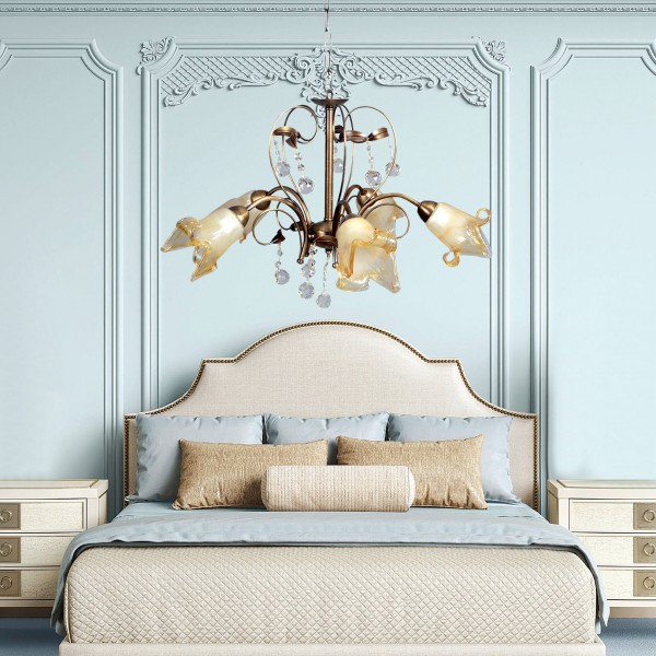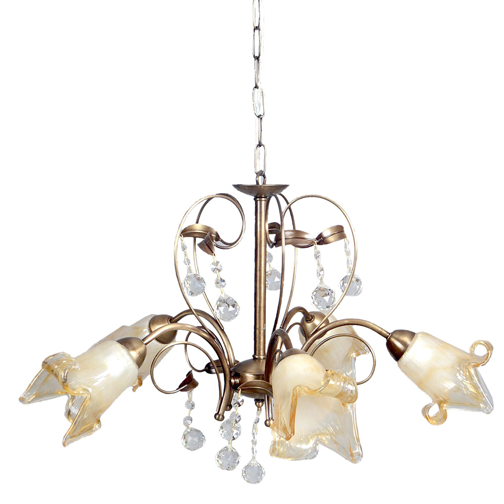 Πρόκειται για ένα κρεμαστό φωτιστικό από οξυντέ μέταλλο και πέντε λαμπτήρες. Τα μελί γυαλιά καλύπτουν τους λαμπτήρες και τα διάφανα κρύσταλλα του δίνουν μια επιπλέον λάμψη. Η μεταλλική ανάρτηση είναι ρυθμιζόμενη για να προσαρμοστεί στον κάθε χώρο.