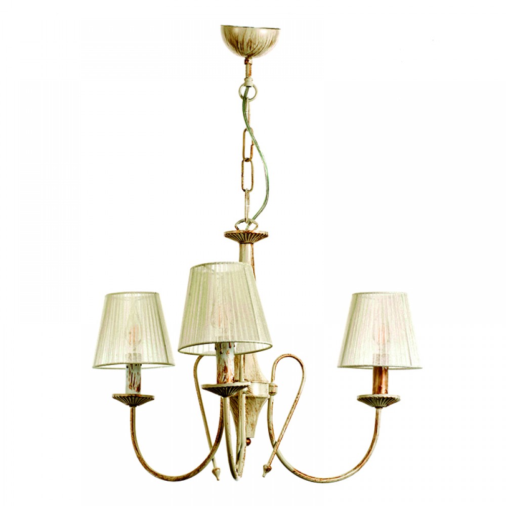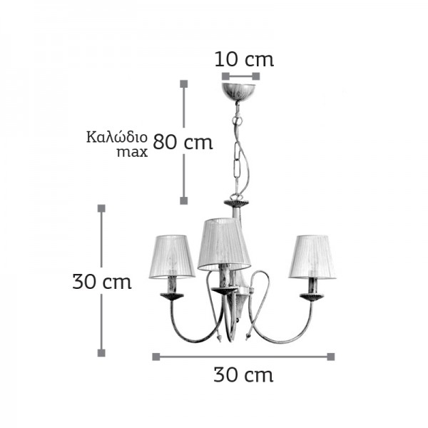 Πρόκειται για ένα μεταλλικό κρεμαστό φωτιστικό σε απόχρωση μπεζ πατίνας. Τη λιτή σχεδίαση συμπληρώνουν τα υφασμάτινα λευκά καπέλα από οργάντζα που καλύπτουν τους τρεις λαμπτήρες. Η μεταλλική ανάρτηση είναι ρυθμιζόμενη ώστε να προσαρμοστεί στον κάθε χώρο.