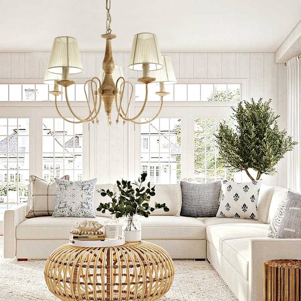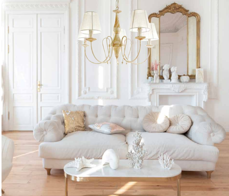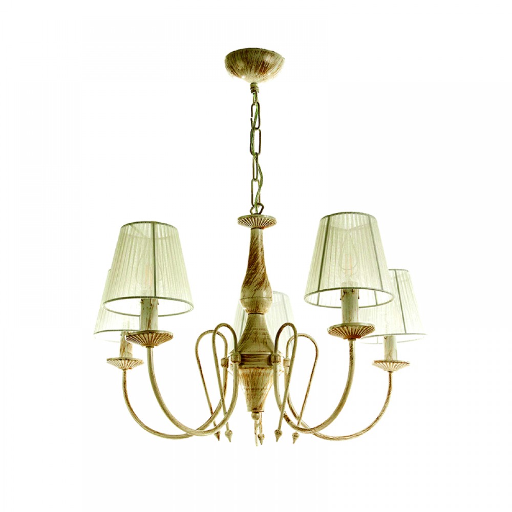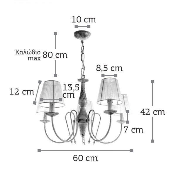Πρόκειται για ένα μεταλλικό κρεμαστό φωτιστικό σε απόχρωση μπεζ πατίνας. Τη λιτή σχεδίαση συμπληρώνουν τα υφασμάτινα λευκά καπέλα από οργάντζα που καλύπτουν τους πέντε λαμπτήρες. Η μεταλλική ανάρτηση είναι ρυθμιζόμενη ώστε να προσαρμοστεί στον κάθε χώρο.