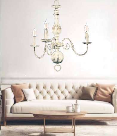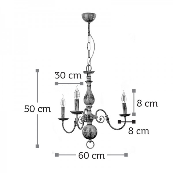 Πρόκειται για ένα κρεμαστό φωτιστικό από μέταλλο σε λευκή πατίνα με τρεις λαμπτήρες. Κατάλληλο για διακόσμηση κλασσικών εσωτερικών χώρων. Η μεταλλική ανάρτηση είναι ρυθμιζόμενη για να προσαρμοστεί στον κάθε χώρο. Διατίθεται και λευκό υφασμάτινο καπέλο για πιο απαλό φωτισμό το οποίο θα πρέπει να ζητηθεί επιπλέον.