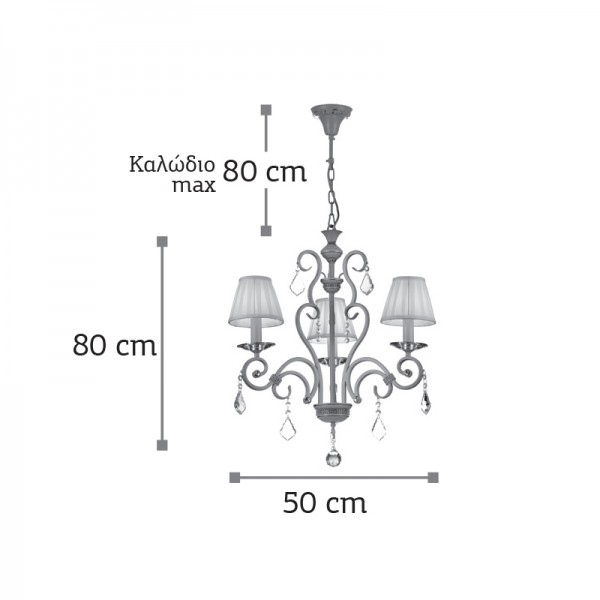 Πρόκειται για ένα μπεζ μεταλλικό κρεμαστό φωτιστικό με τρεις λαμπτήρες και διακριτική ύπαρξη κρυστάλλων. Τα μπεζ υφασμάτινα καπέλα που καλύπτουν τους λαμπτήρες δίνουν έναν απαλό φωτισμό στον χώρο. Η μεταλλική ανάρτηση είναι ρυθμιζόμενη ώστε να προσαρμοστεί στον κάθε χώρο.