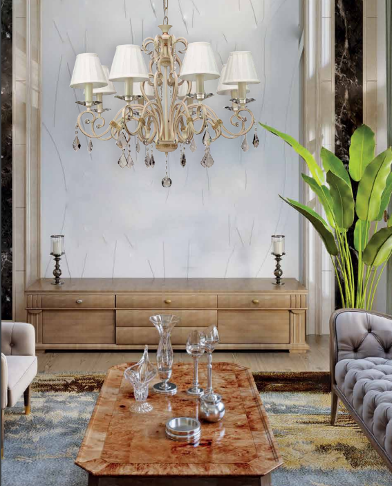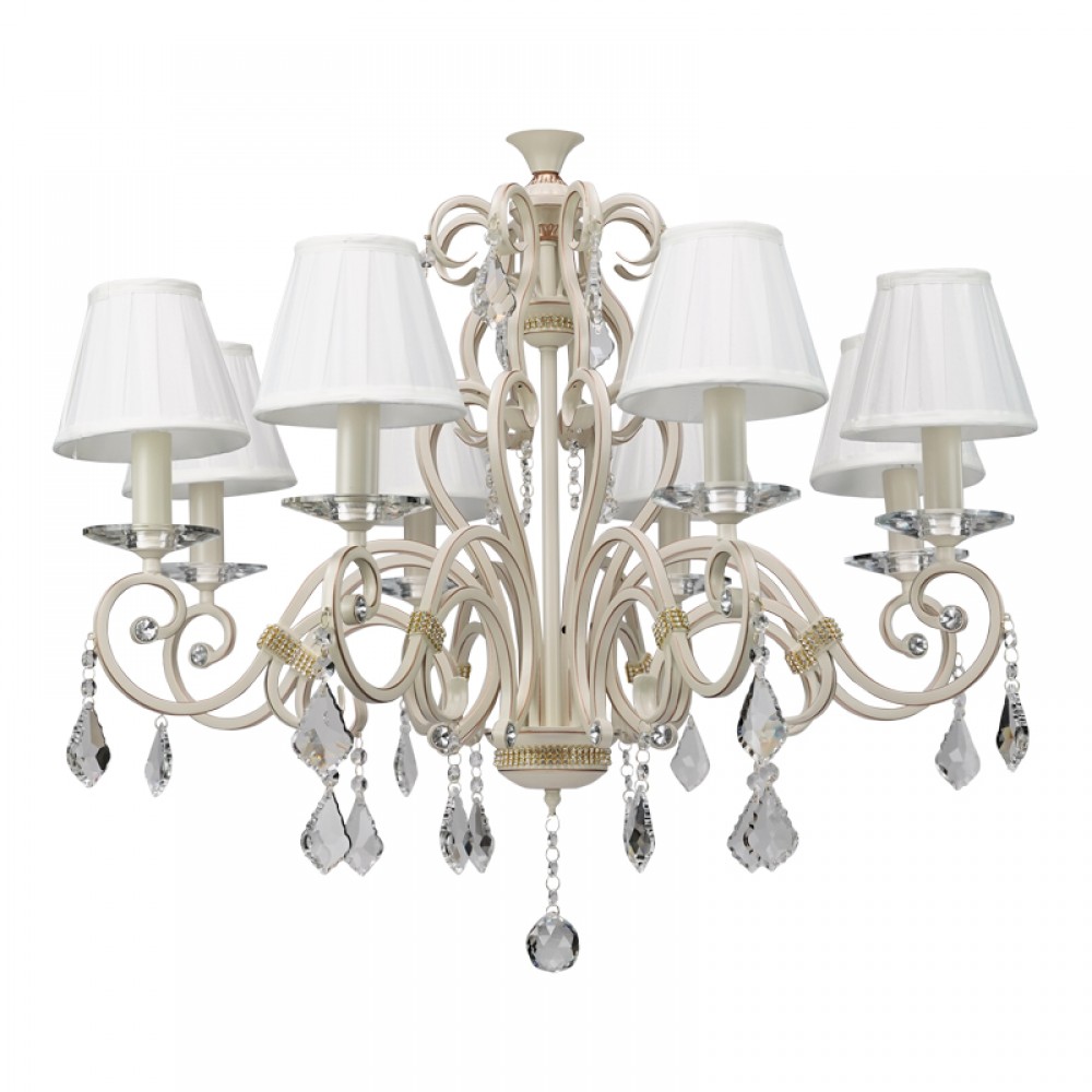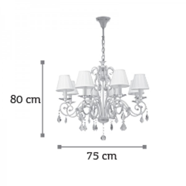 Πρόκειται για ένα μπεζ μεταλλικό κρεμαστό φωτιστικό με οχτώ λαμπτήρες και διακριτική ύπαρξη κρυστάλλων. Τα μπεζ υφασμάτινα καπέλα που καλύπτουν τους λαμπτήρες δίνουν έναν απαλό φωτισμό στον χώρο. Η μεταλλική ανάρτηση είναι ρυθμιζόμενη ώστε να προσαρμοστεί στον κάθε χώρο.