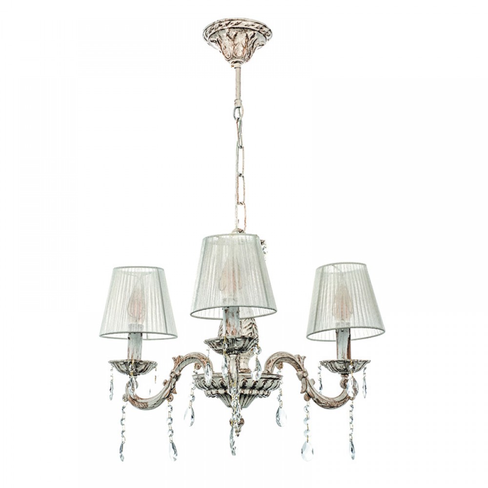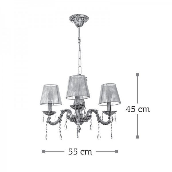 Πρόκειται για ένα μεταλλικό κρεμαστό φωτιστικό σε απόχρωση μπεζ πατίνας με τρεις λαμπτήρες. Τα κρύσταλλα δίνουν μια επιπλέον λάμψη, αλλά μπορούν και να αφαιρεθούν. Η μεταλλική ανάρτηση είναι ρυθμιζόμενη για να προσαρμοστεί στον κάθε χώρο. Διατίθεται και λευκό υφασμάτινο καπέλα για πιο απαλό φωτισμό το οποίο θα πρέπει να ζητηθεί επιπλέον.