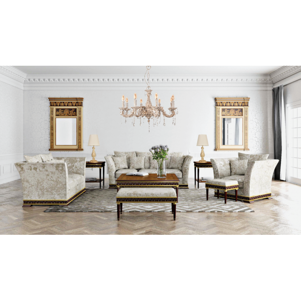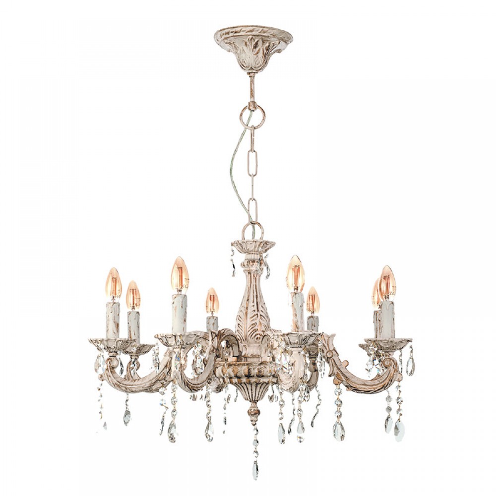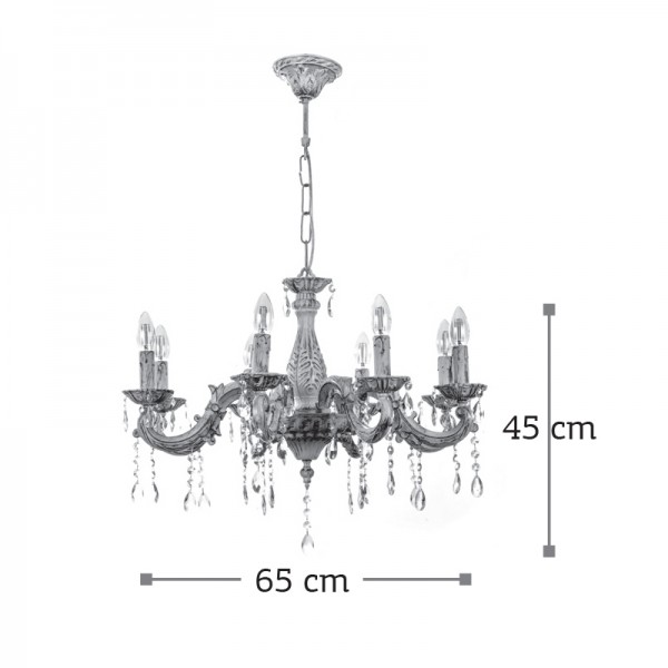 Πρόκειται για ένα μεταλλικό κρεμαστό φωτιστικό σε απόχρωση μπεζ πατίνας με οκτώ λαμπτήρες. Τα κρύσταλλα δίνουν μια επιπλέον λάμψη, αλλά μπορούν και να αφαιρεθούν. Η μεταλλική ανάρτηση είναι ρυθμιζόμενη για να προσαρμοστεί στον κάθε χώρο. Διατίθεται και λευκό υφασμάτινο καπέλα για πιο απαλό φωτισμό το οποίο θα πρέπει να ζητηθεί επιπλέον.