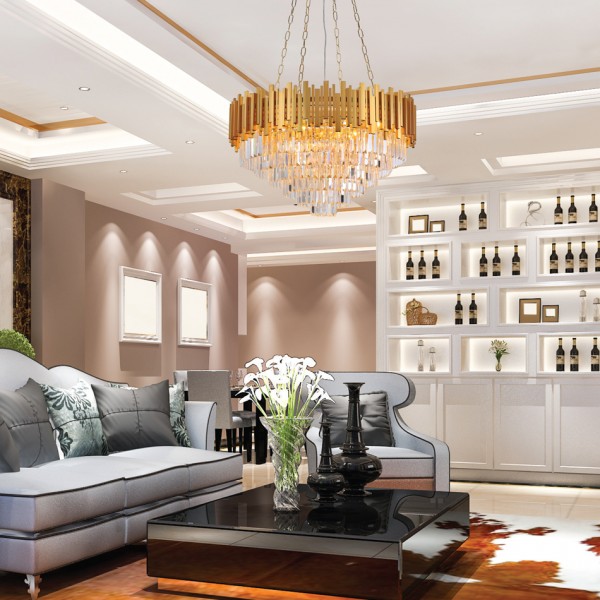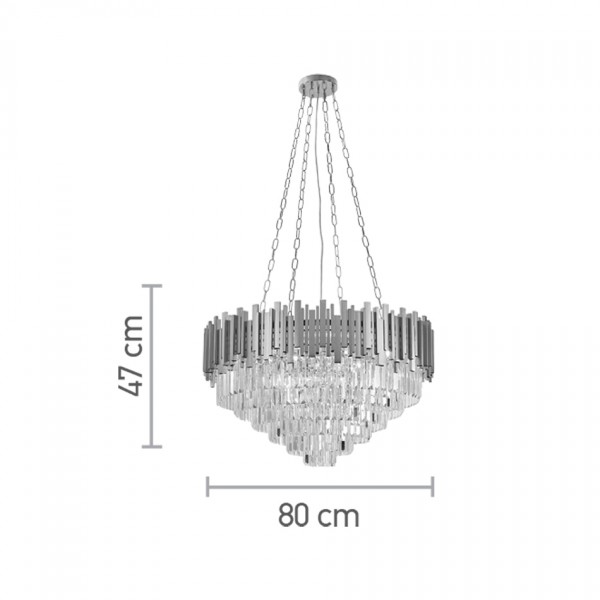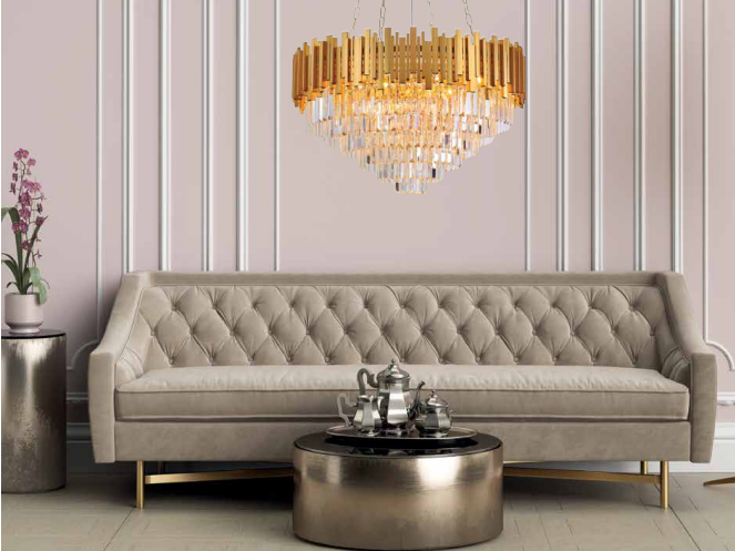 Πρόκειται για ένα κρεμαστό φωτιστικό κατασκευασμένο από χρυσαφί αλουμίνιο. Η ιδιαίτερή του σχεδίαση συμπληρώνεται από τα κρύσταλλα, καθιστώντας το εντυπωσιακό.
