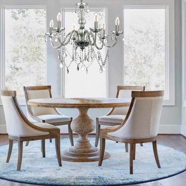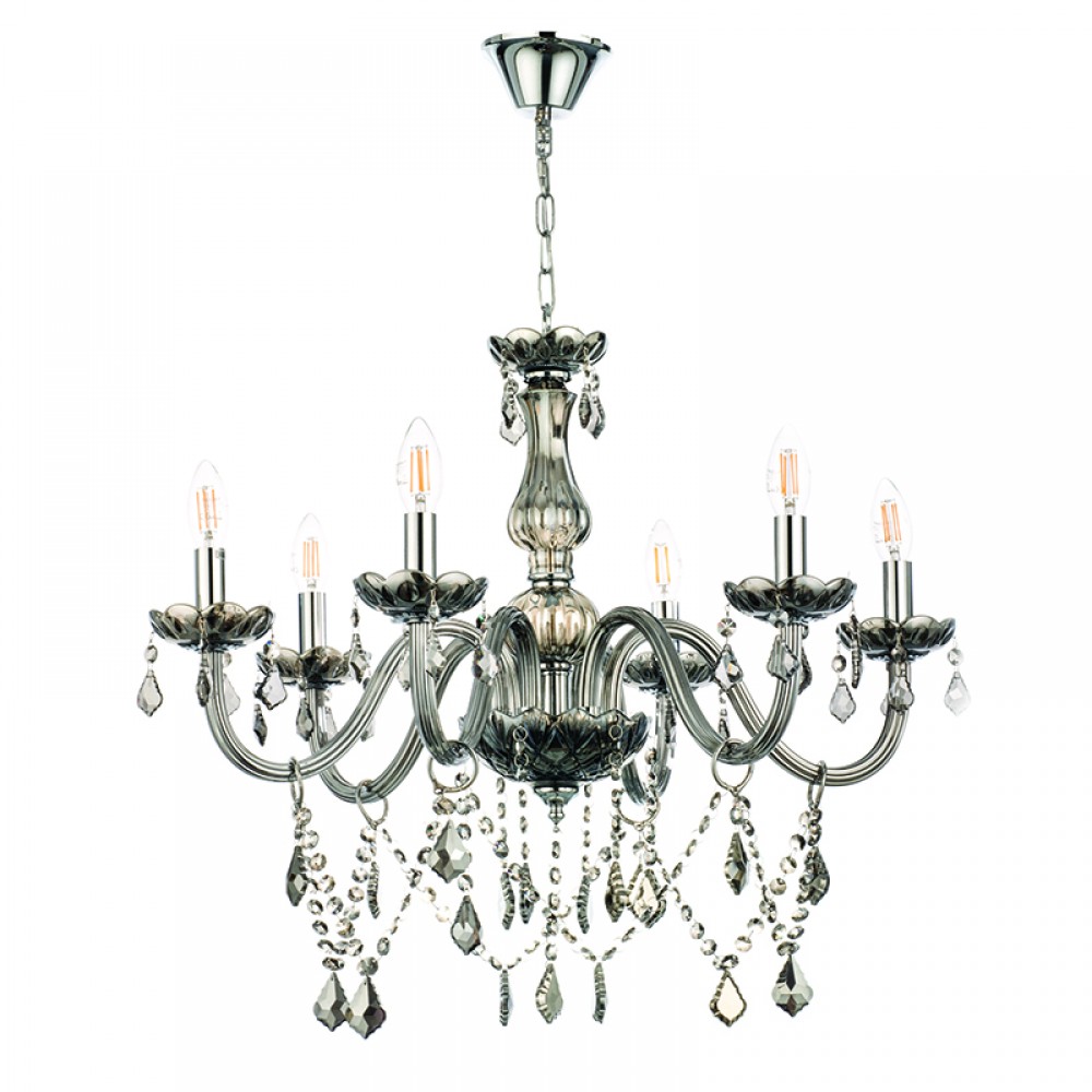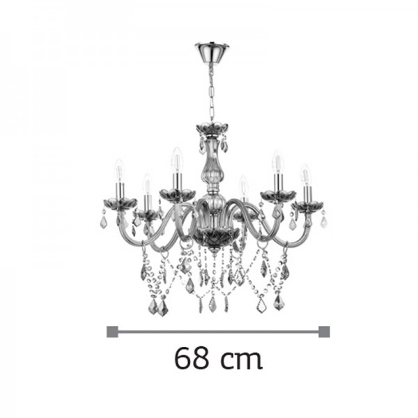 Πρόκειται για ένα φιμέ γυάλινο κρεμαστό φωτιστικό με έξι λαμπτήρες. Τόσο τα φιμέ κρύσταλλα που κρέμονται όσο και οι χρώμιο μεταλλικές λεπτομέρειες του προσδίδουν μια επιπλέον λάμψη. Η χρώμιο μεταλλική ανάρτηση είναι ρυθμιζόμενη και προσαρμόζεται στον κάθε χώρο.
