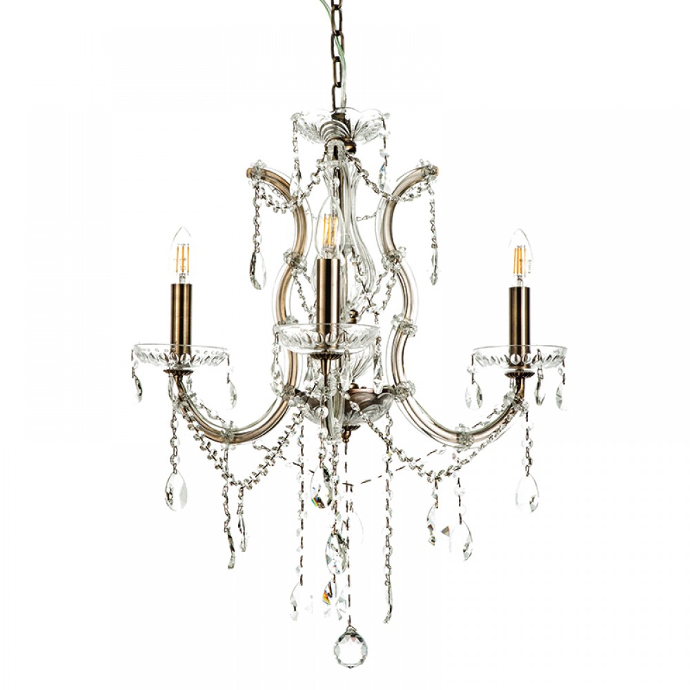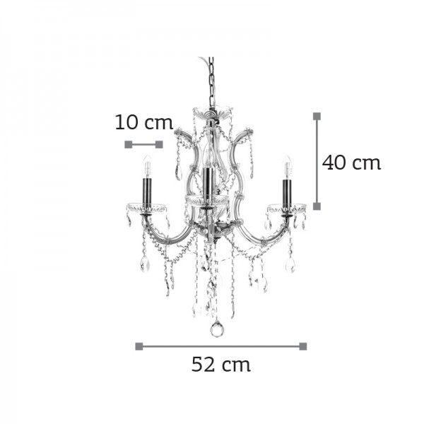 Πρόκειται για ένα κρεμαστό φωτιστικό με τρεις λαμπτήρες. Το σώμα του αποτελείται από οξυντέ μέταλλο που καλύπτεται από διάφανο γυαλί. Τα κρύσταλλα που το διακοσμούν είναι διάφανα. Η μεταλλική ανάρτηση είναι ρυθμιζόμενη ώστε να προσαρμόζεται στον κάθε χώρο. Διατίθεται και η επιλογή του υφασμάτινου καπέλου το οποίο πρέπει να ζητηθεί επιπλέον.