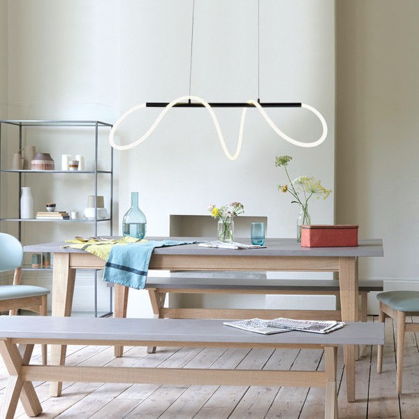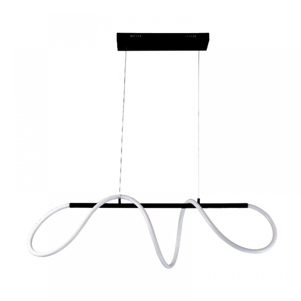 Πρόκειται για ένα κρεμαστό φωτιστικό με αφαιρετική σχεδίαση. Το μαύρο μέταλλο συμπληρώνει τον led φωτιζόμενο και εύκαμπτο σωλήνα θερμής απόχρωσης. Το φως διαχέεται σε όλον τον χώρο και η ανάρτησή του είναι ρυθμιζόμενη. Διακοσμεί ιδανικά οποιονδήποτε μοντέρνο εσωτερικό χώρο.