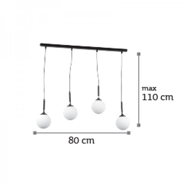Πρόκειται για ένα μαύρο μεταλλικό φωτιστικό με λευκή οπαλίνα και τέσσερις λαμπτήρες. Το ύψος μπορεί να ρυθμιστεί ώστε να προσαρμοστεί στον μοντέρνο χώρο τοποθέτησής του.