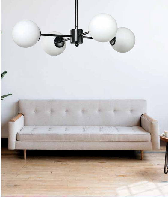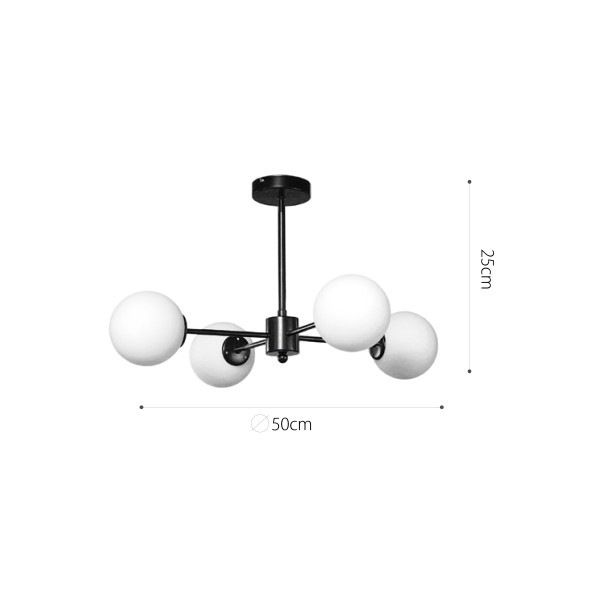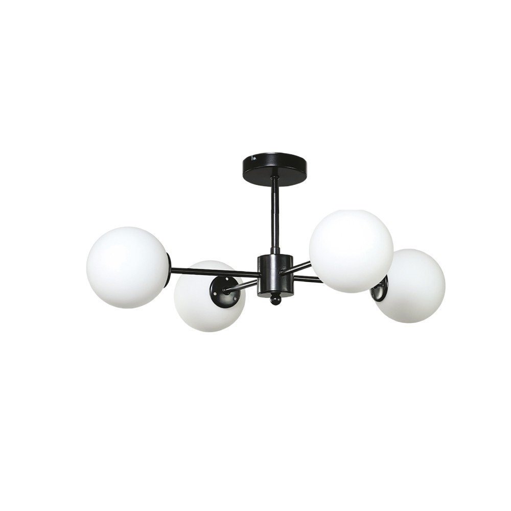 Πρόκειται για ένα μαύρο μεταλλικό φωτιστικό με λευκή οπαλίνα στο τελείωμα και τέσσερεις λαμπτήρες. Η μίνιμαλ σχεδίασή του το τοποθετεί ιδανικά σε οποιονδήποτε μοντέρνο εσωτερικό χώρο, ακόμα και αν είναι χαμηλοτάβανος.