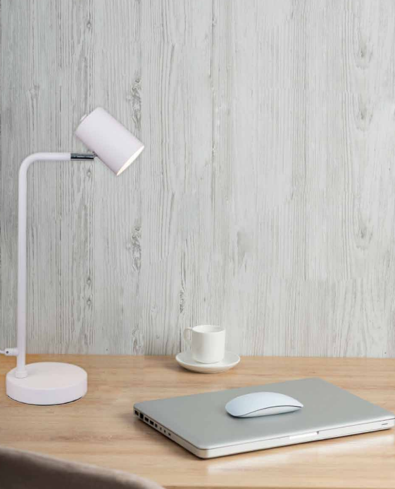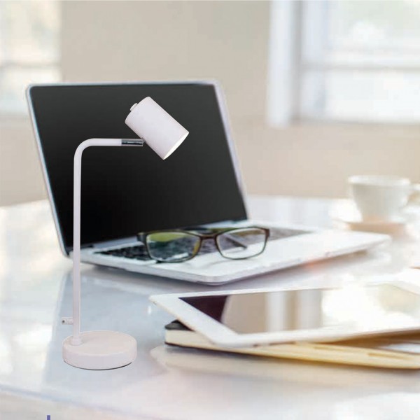 Πρόκειται για ένα επιτραπέζιο φωτιστικό σε λευκή απόχρωση με ασημί λεπτομέρειες σε μίνιμαλ αισθητική.