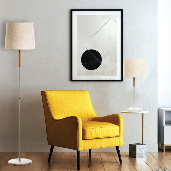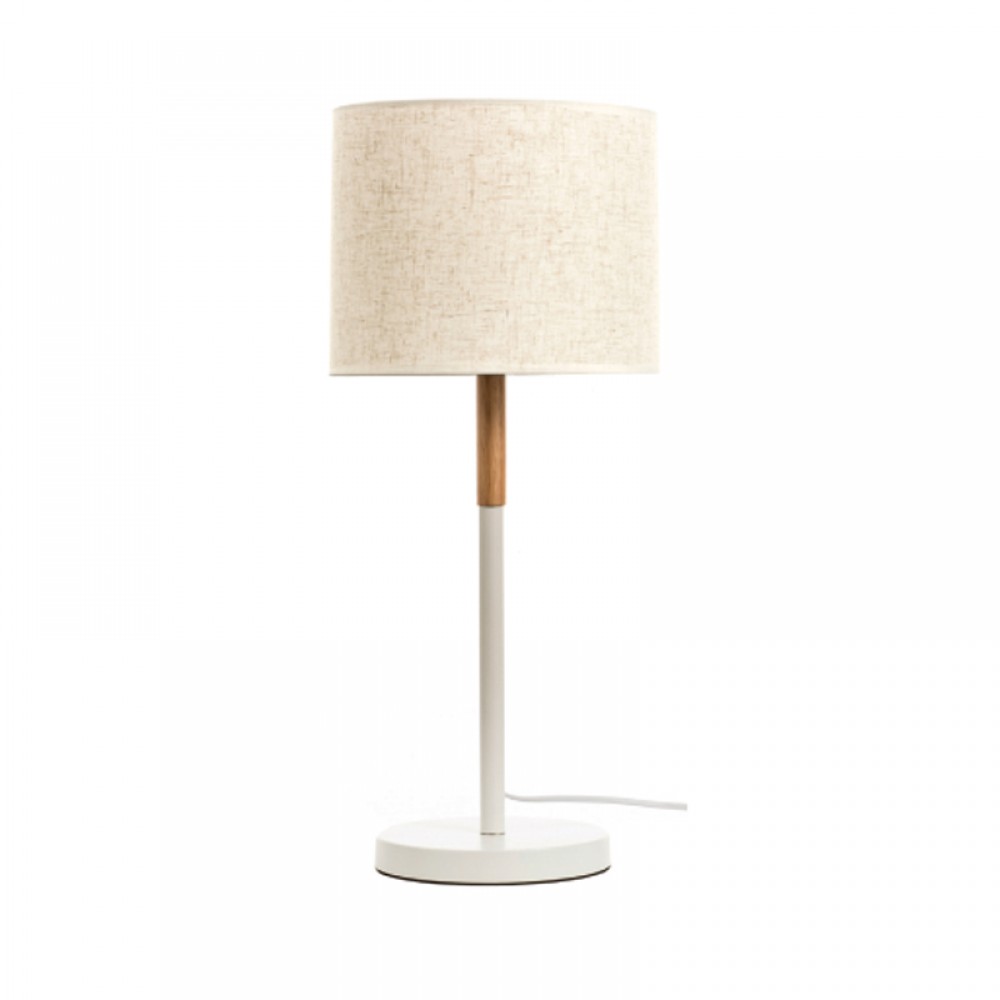 Επιτραπέζιο φωτιστικό από λευκό μέταλλο με διακριτικό ξύλο στο πάνω μέρος του. Το αμπαζούρ προσδίδει ρομαντικό ύφος στον χώρο, αφού ο φωτισμός του είναι πιο διακριτικός.