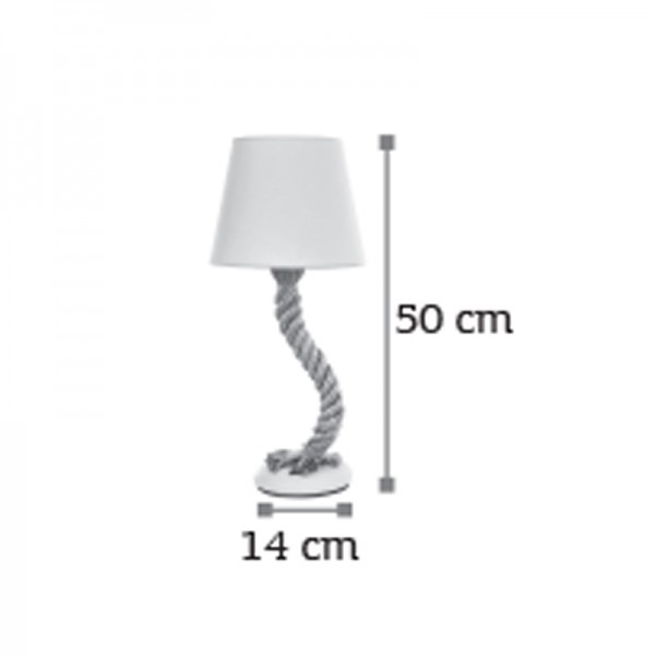 Πρόκειται για ένα επιτραπέζιο φωτιστικό από καφέ σχοινί και μαύρο μέταλλο. Είναι ιδανικό για όποιον επιδιώκει μια ρομαντική διάθεση στο χώρο του, καθώς έχει και λευκό υφασμάτινο καπέλο που εξυπηρετεί τον σκοπό αυτόν.