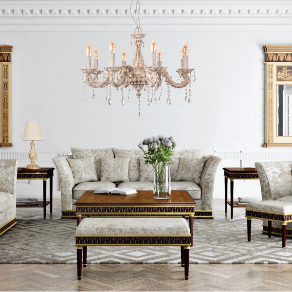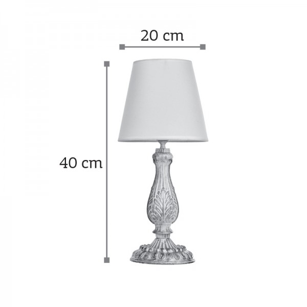 Πρόκειται για ένα μεταλλικό επιτραπέζιο φωτιστικό σε απόχρωση μπεζ πατίνας. Η ιδιαίτερη κλασσική του σχεδίαση συμπληρώνεται από το λευκό υφασμάτινο καπέλο.