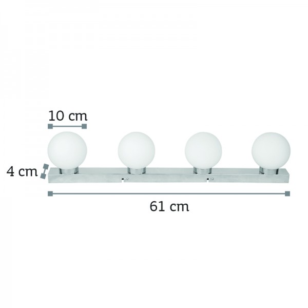 Πρόκειται για ένα επιτοίχιο φωτιστικό από χρώμιο μέταλλο λευκή οπαλίνα και τέσσερις λαμπτήρες. Η μίνιμαλ σχεδίαση και το σχήμα του το τοποθετεί σε μοντέρνους χώρους εσωτερικής διακόσμησης. Τοποθετείται και ως φωτιστικό οροφής!