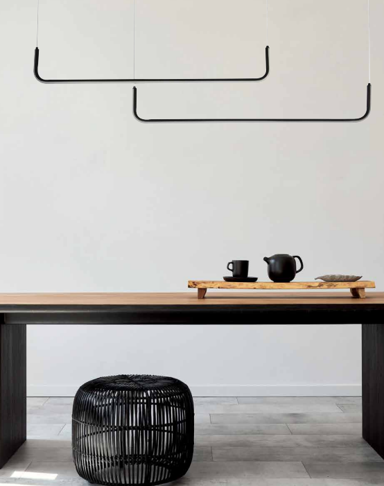 Πρόκειται για ένα μαύρο μεταλλικό κρεμαστό φωτιστικό μίνιμαλ σχεδίασης. Η λευκή ακρυλική του επιφάνεια καλύπτει τον LED φωτισμό 3CCT απόδοσης.