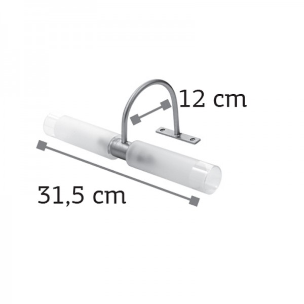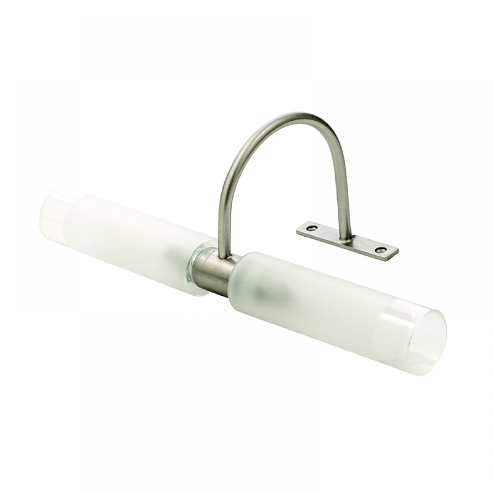 Πρόκειται για ένα επιτοίχιο φωτιστικό κατασκευασμένο από μέταλλο σε νίκελ ματ απόχρωση με δύο λαμπτήρες που καλύπτονται από κυλινδρικό γυαλί αμμοβολής με διάφανες λεπτομέρειες. Είναι η ιδανική επιλογή για φωτισμό μπάνιου τοποθετημένο πάνω από τον καθρέπτη και όταν υπάρχει έλλειψη χώρου για την βάση του. Το φως διαχέεται ομοιόμορφα.