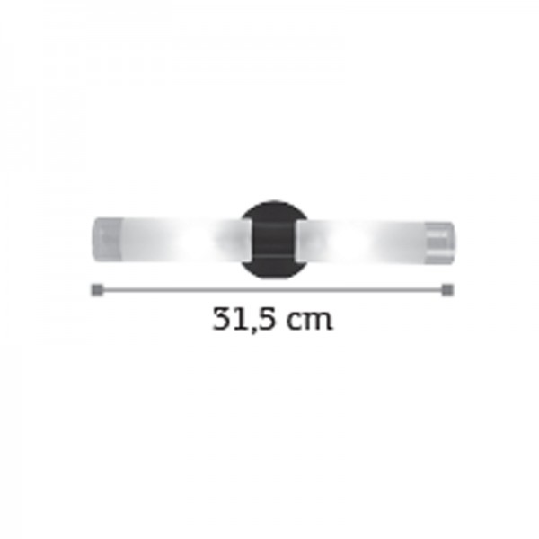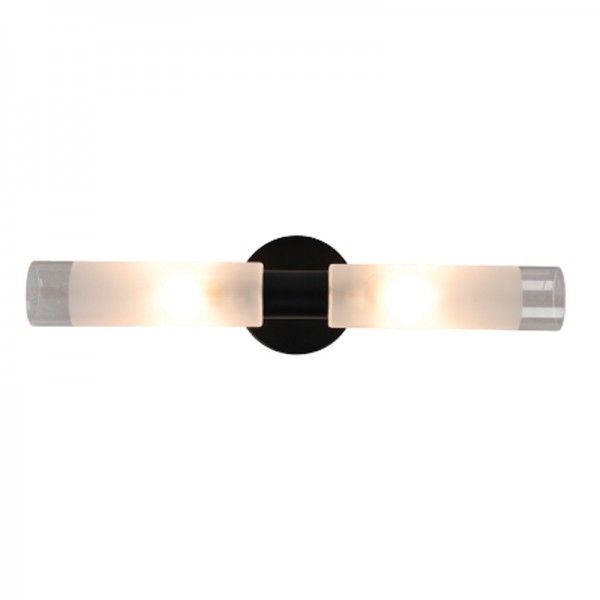 Πρόκειται για ένα επιτοίχιο φωτιστικό κατασκευασμένο από μέταλλο σε μαύρη απόχρωση με δύο λαμπτήρες που καλύπτονται από κυλινδρικό γυαλί αμμοβολής με διάφανες λεπτομέρειες. Είναι η ιδανική επιλογή για φωτισμό μπάνιου τοποθετημένο πάνω από τον καθρέπτη αφού το φως διαχέεται ομοιόμορφα.