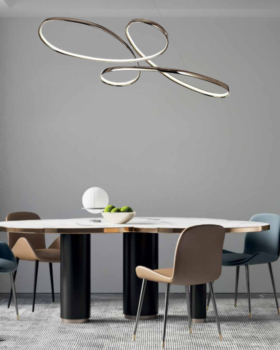 Πρόκειται για ένα χρυσό ματ κρεμαστό φωτιστικό με κυκλική σχεδίαση κατασκευασμένο από αλουμίνιο. Η λευκή ακρυλική του επιφάνεια καλύπτει τον led φωτισμό 3CCT απόχρωσης. Η ανάρτησή του είναι ρυθμιζόμενη ώστε να προσαρμόζεται στον κάθε χώρο.