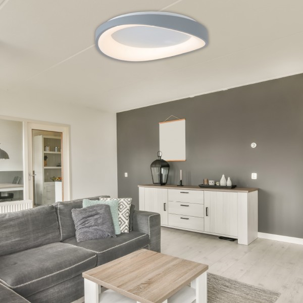 Πρόκειται για μία πλαφονιέρα οροφής κατασκευασμένη από μαύρο μέταλλο και λευκό ακρυλικό μίνιμαλ σχεδίασης. Η βάση είναι από λευκό μέταλλο. Ο φωτισμός led μπορεί να λάβει από θερμή ως και ψυχρή απόχρωση και είναι ρυθμιζόμενη από το κοντρόλ που περιέχεται.