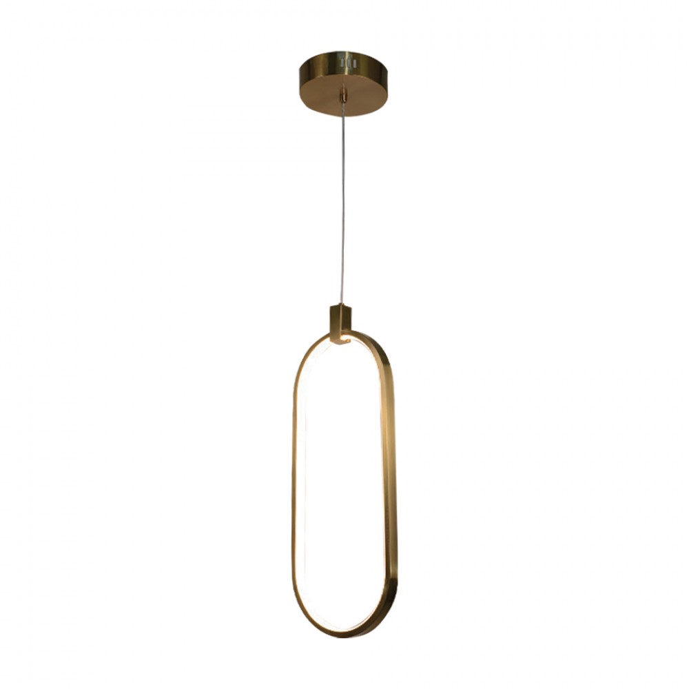 Πρόκειται για ένα χρυσαφί μεταλλικό κρεμαστό φωτιστικό μίνιμαλ σχεδίασης. Η λευκή ακρυλική του επιφάνεια καλύπτει τον LED φωτισμό θερμής απόδοσης.