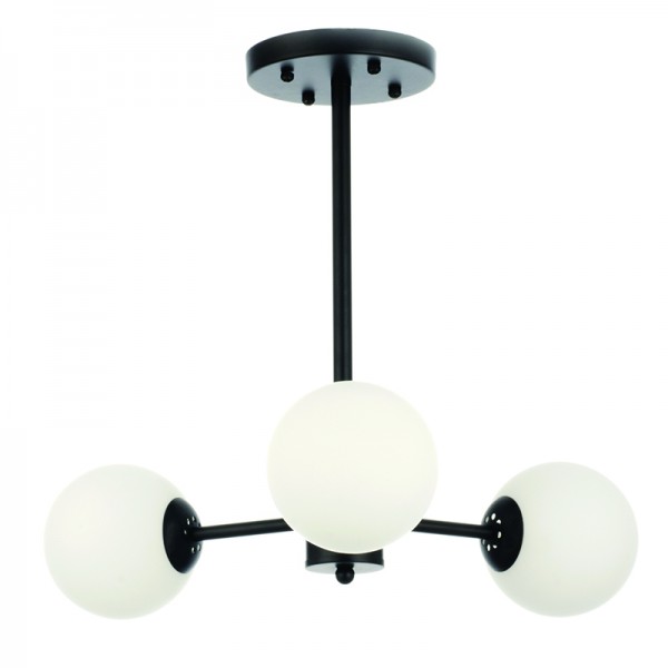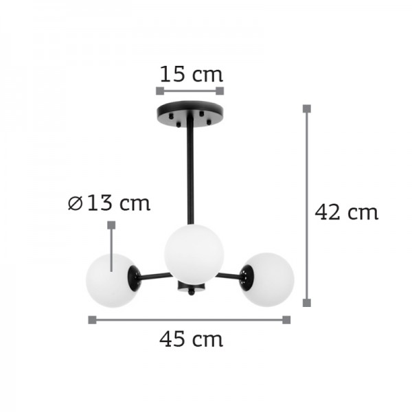Πρόκειται για ένα μαύρο μεταλλικό φωτιστικό με λευκή οπαλίνα στο τελείωμα και τρεις λαμπτήρες. Η μίνιμαλ σχεδίασή του το τοποθετεί ιδανικά σε οποιονδήποτε μοντέρνο εσωτερικό χώρο, ακόμα και αν είναι χαμηλοτάβανος.