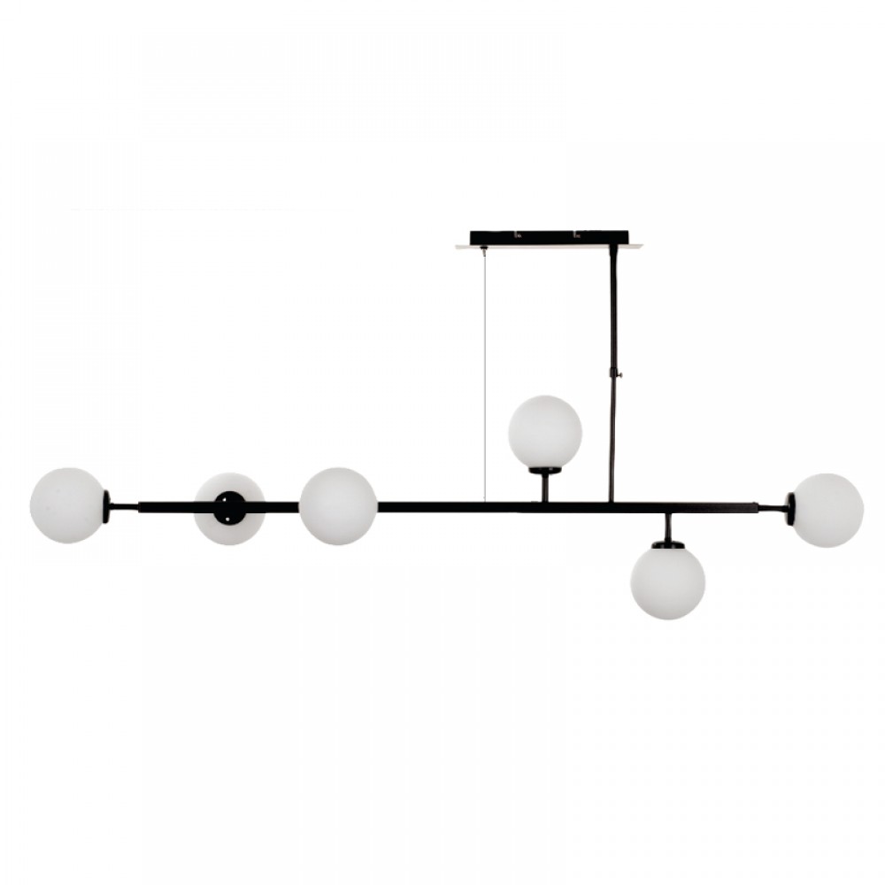 Πρόκειται για ένα μαύρο μεταλλικό κρεμαστό φωτιστικό με λευκή οπαλίνα και έξι λαμπτήρες. Τοποθετείται ιδανικά πάνω από τετράγωνα και ορθογώνια τραπέζια, ώστε να επιτευχθεί ομοιομορφία. Η ανάρτησή του δίνει τη δυνατότητα να προσαρμοστεί στον μοντέρνο χώρο τοποθέτησή του.
