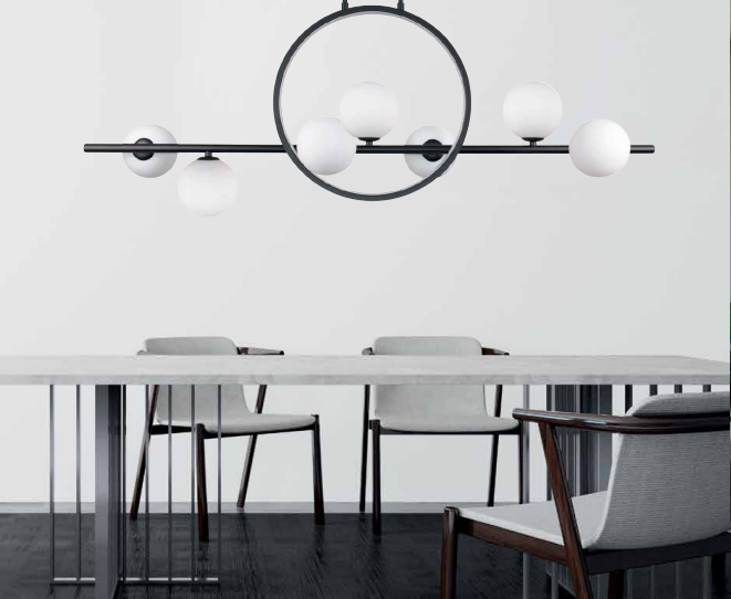 Πρόκειται για ένα φωτιστικό κατασκευασμένο από μαύρο μέταλλο. Οι λευκές οπαλίνες καλύπτουν φωτισμό G9 λαμπτήρων και η λευκή ακρυλική επιφάνεια LED φωτισμό θερμής απόχρωσης.