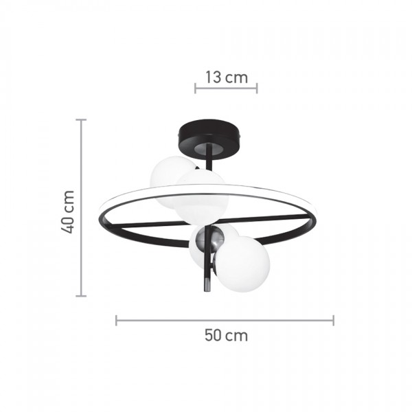 Πρόκειται για ένα φωτιστικό κατασκευασμένο από μαύρο και χρυσαφί μέταλλο. Οι λευκές οπαλίνες καλύπτουν φωτισμό G9 λαμπτήρων και η λευκή ακρυλική επιφάνεια LED φωτισμό θερμής απόχρωσης.