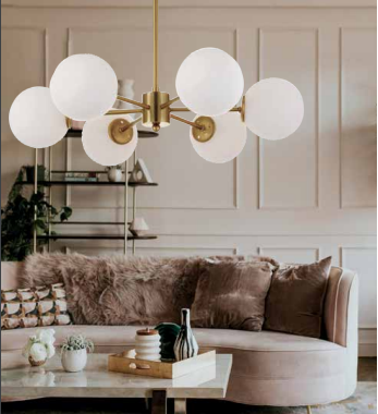 Πρόκειται για ένα χρυσό ματ μεταλλικό φωτιστικό με λευκή οπαλίνα στο τελείωμα και έξι λαμπτήρες. Η μίνιμαλ σχεδίασή του το τοποθετεί ιδανικά σε οποιονδήποτε μοντέρνο αλλά και πιο κλασσικό εσωτερικό χώρο. Η ανάρτησή του είναι μεταλλική και ρυθμιζόμενη ώστε να προσαρμοστεί ιδανικά στον χώρο τοποθέτησής του.