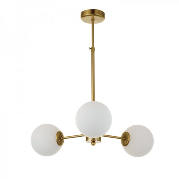 Πρόκειται για ένα χρυσό ματ μεταλλικό φωτιστικό με λευκή οπαλίνα στο τελείωμα και τρεις λαμπτήρες. Η μίνιμαλ σχεδίασή του το τοποθετεί ιδανικά σε οποιονδήποτε μοντέρνο αλλά και πιο κλασσικό εσωτερικό χώρο. Η ανάρτησή του είναι μεταλλική και ρυθμιζόμενη ώστε να προσαρμοστεί ιδανικά στον χώρο τοποθέτησής του.
