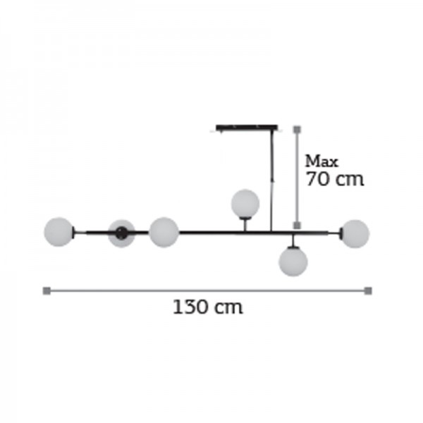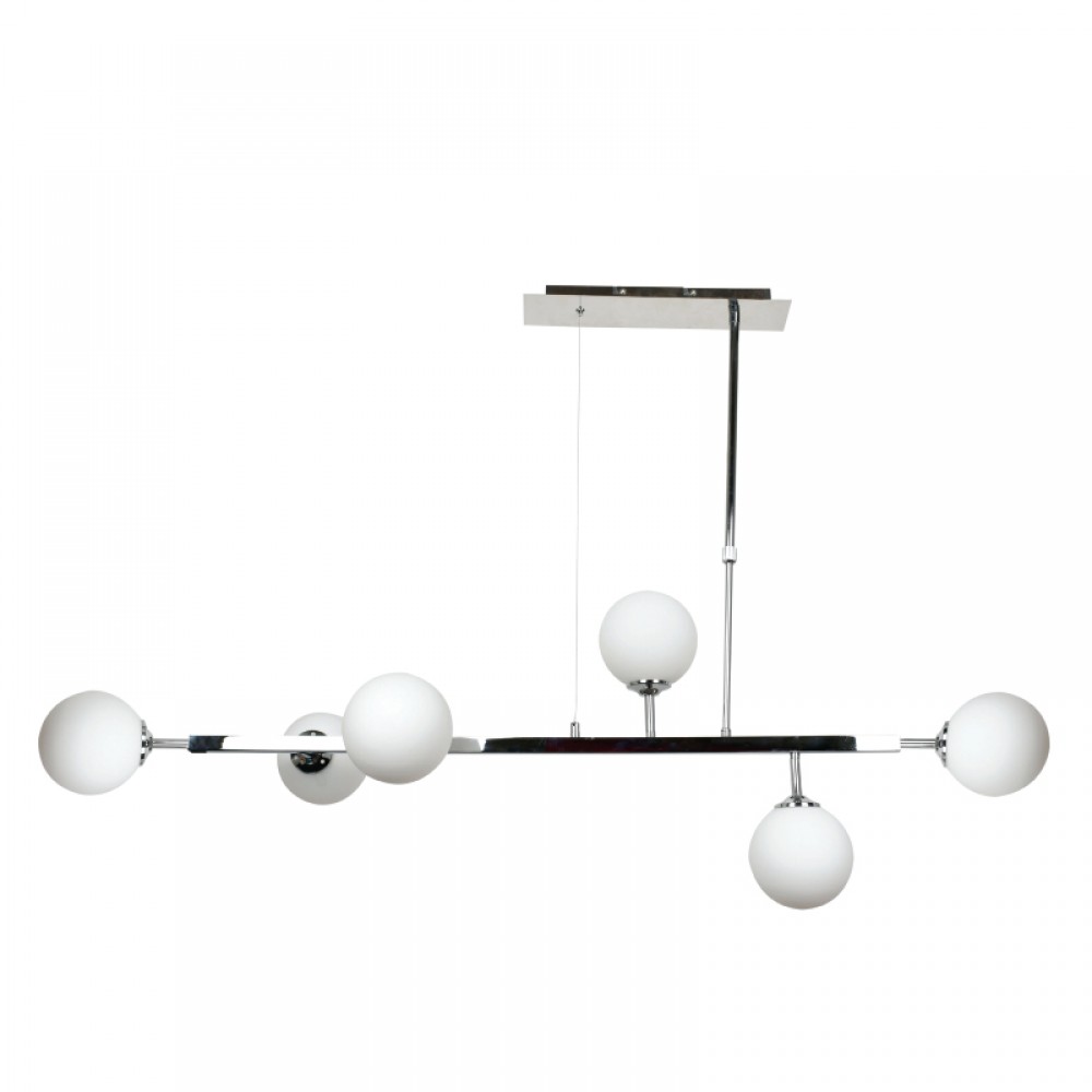 Πρόκειται για ένα χρώμιο μεταλλικό κρεμαστό φωτιστικό με λευκή οπαλίνα και έξι λαμπτήρες. Τοποθετείται ιδανικά πάνω από τετράγωνα και ορθογώνια τραπέζια,