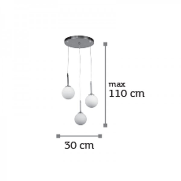 Πρόκειται για ένα χρώμιο μεταλλικό φωτιστικό με λευκή οπαλίνα και τρεις λαμπτήρες. Το ύψος μπορεί να ρυθμιστεί ώστε να προσαρμοστεί στον μοντέρνο χώρο τοποθέτησής του.